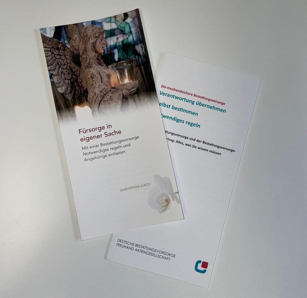 Sie haben die Möglichkeit den Betrag der voraussichtlichen Bestattungskosten über ein Bestattungsvorsorge-Treuhandvertrag auf ein Treuhandkonto der Deutschen Bestattungsvorsorge Treuhand AG einzuzahlen. Entweder auf einmal oder in monatlichen Teilzahlungen ab 100 €. Somit sind dann die Bestattungskosten, zum jetzigen Zeitpunkt, auch abgesichert.